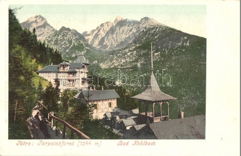 Tátra, Magas Tátra, Vysoké Tatry; Tarpatakfüred szálloda, Lomnici csúcs. Kiadja Cattarino 121. / Hotel Kohlbach, Lomnitzerspitze / Lomnicky stít / hotel and mountain peak