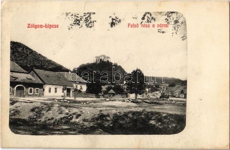 Beschreibung: Zólyomlipcse, Slovenská Lupca; Felső rész a várral. Kiadja Dorozsmai Sándor 715. / Lupciansky hrad / street view, castle (EK)