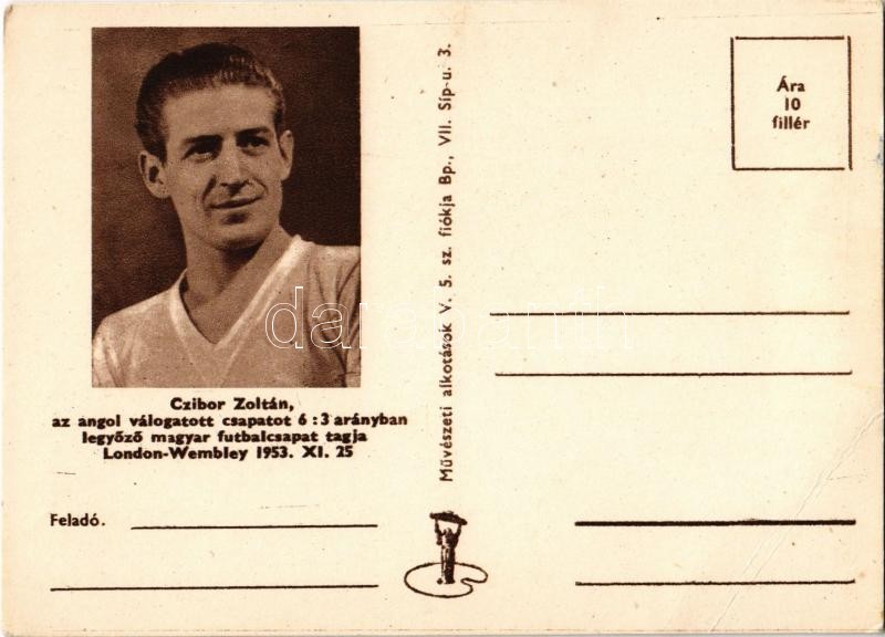 Czibor Zoltán, az angol válogatott csapatot 6:3 arányban legyőző magyar Aranycsapat futballcsapat tagja London-Wembley 1953. XI. 25. Művészeti Alkotások / Hungarian football player of the Golden Team (EB)
