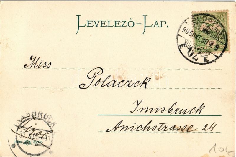 Beschreibung: 1905 Budapest, Királyi vár, Népszínház, Nemzeti színház, Lánchíd, Ferenc József híd, Nemzeti múzeum, Központi (Keleti) pályaudvar. Art Nouveau