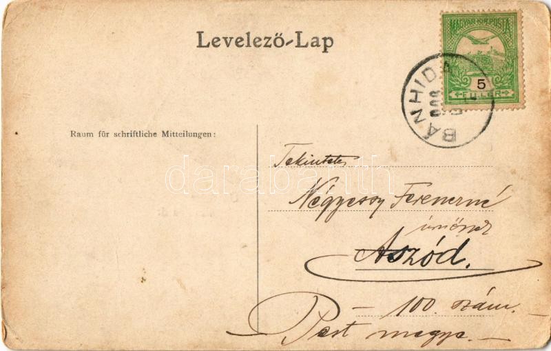 Beschreibung: 1908 Bánhida (Tatabánya), Templom, Nagyvendéglő, étterem, Községi óvoda. Art Nouveau (kopott sarkak / worn corners)