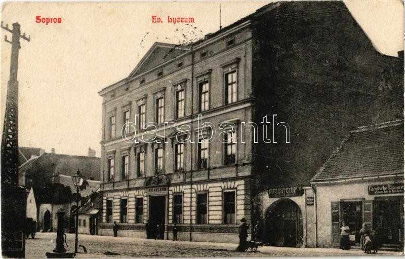 1909 Sopron, Evangélikus lyceum, Nitsch György üzlete, Chemische Putza... https://www.darabanth.com/de/349-Fernauktion/349.0/Ansichtskarten/Ungarn~2000005/1909-Sopron-Evangelikus-lyceum-Nitsch-Gyorgy-uzlete-Chemische-Putzanstube-Kummert-L-utoda-4~II1970404