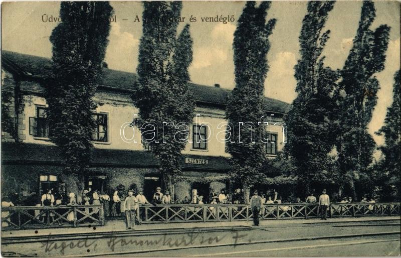 Beschreibung: 1928 Szentes, Pályaudvar, vasútállomás, vasúti vendéglő, étterem, vasutasok. Kiadja Szilágyi Dezső (EK)