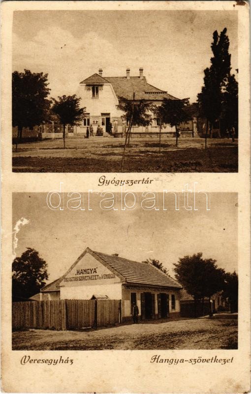 Beschreibung: 1932 Veresegyház, gyógyszertár, Hangya szövetkezet üzlete és vendéglője és saját kiadása (EK)