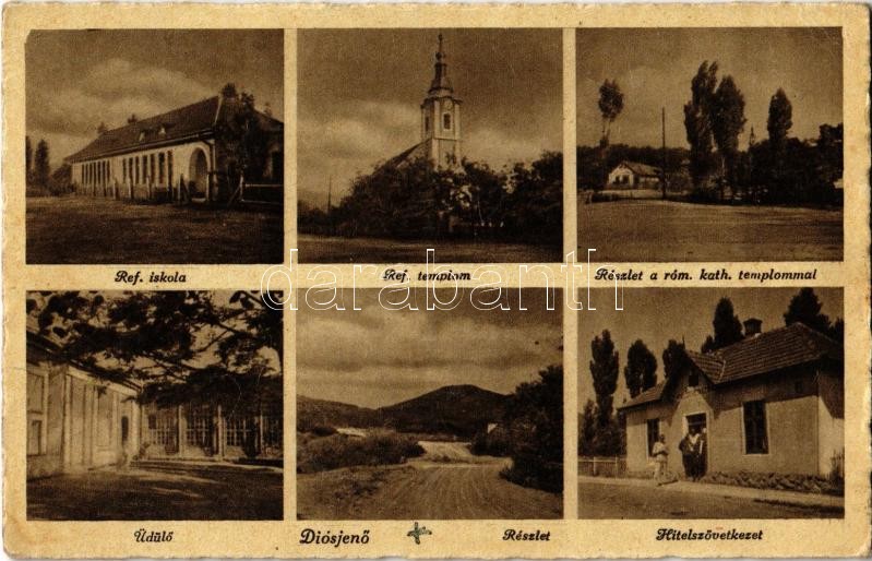 Beschreibung: Diósjenő, Református templom és iskola, Római katolikus templom, üdülő, hitelszövetkezet