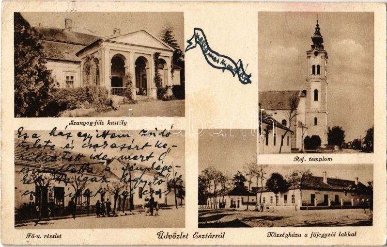 Esztár, Szunyog-féle kastély, Református templom, Fő utca, községháza,... https://www.darabanth.com/de/349-Fernauktion/349.0/Ansichtskarten/Ungarn~2000005/Esztar-Szunyog-fele-kastely-Reformatus-templom-Fo-utca-kozseghaza-fojegyzoi-lak-EK~II1982916