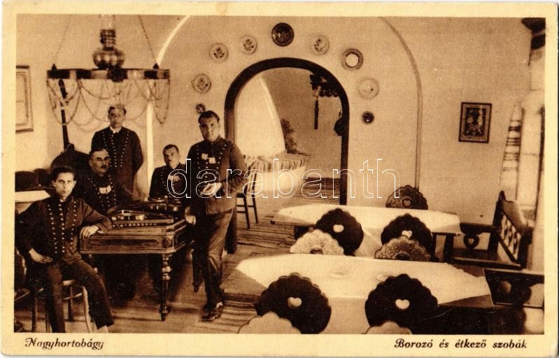 Hortobágy, Nagyhortobágy; Borozó és étkező szobák, belső, zenekar (EK) https://www.darabanth.com/de/349-Fernauktion/349.0/Ansichtskarten/Ungarn~2000005/Hortobagy-Nagyhortobagy-Borozo-es-etkezo-szobak-belso-zenekar-EK~II1981314
