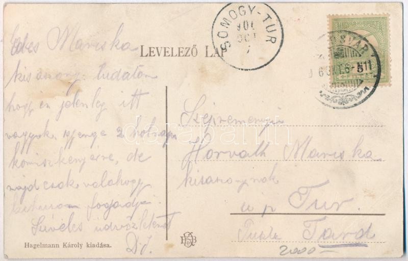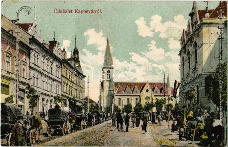 Beschreibung: Kaposvár, Erzsébet utca, lovaskocsik, hintók, Schwarcz Samu üzlete, magyar zászló, drogéria, piaci árusok. Hagelmann Károly kiadása
