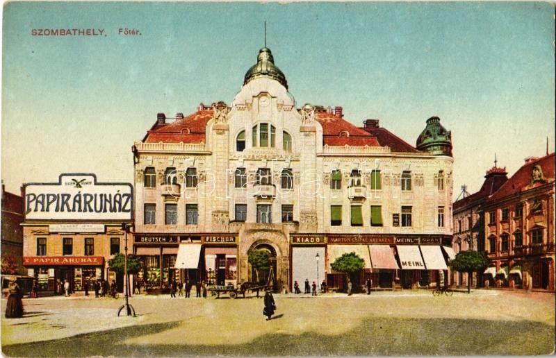 Szombathely, Fő tér, Takarékpénztár palota, Deutsch J., Fischer, Meinl Gyula üzlete, Marton Dávid csipke áruháza, Dukesz Jenő "Sabaria" Papíráruháza, kiadó üzlethelyiség, kerékpár. Dukesz Jenő saját kiadása