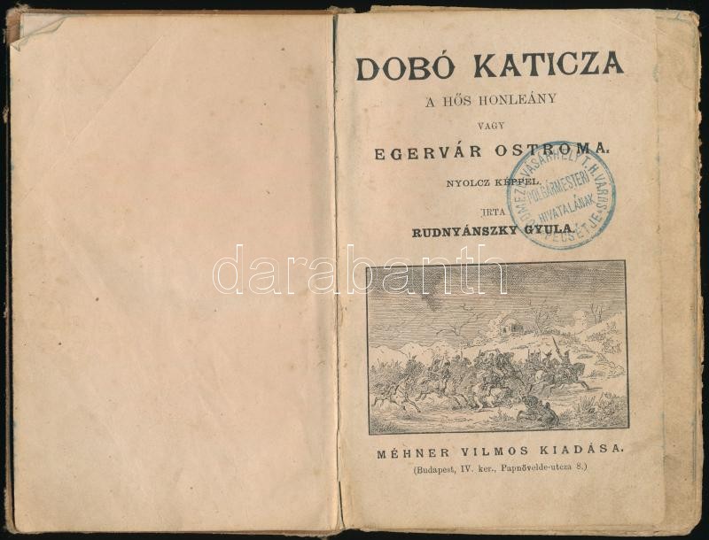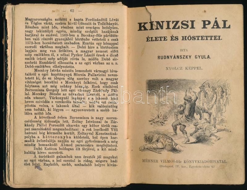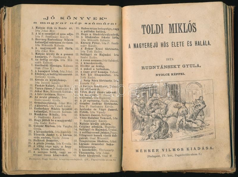 Rudnyánszky Gyula 3 műve: Dobó Katica a hős honleány vagy Egervár ostroma.; Kinizsi Pál: Élete és hőstettei., Toldi Miklós a nagyerejű hős élete és halála. Bp., Méhner Vilmos, 62+63+64 p. Korabeli átkötött egészvászon-kötésben, kopott borítóval, sérült gerinccel, egy hiányzó lappal (Dobó Katica, 15/16.), rossz állapotban
