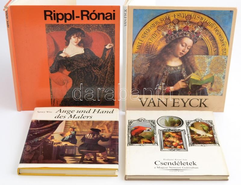 Vegyes művészeti könyvtétel, 4 db.: Keserü Katalin: Rippl-Rónai József. A művészet világa. Bp.,1982,Corvina. Kiadói kartonált papírkötés.; Végh János: Van Eyck. A művészet világa. Bp.,1983,Corvina. Kiadói kartonált papírkötés.; Kisdéginé Kirimi Irén: Csendéletek a Magyar Nemzeti Galériában. Bp.,1977, Corvina. Kiadói egészvászon-kötés, kiadói papír védőborítóban.; Ignacy Witz: Auge und Hand des Malers. Dresden,1981,VEB Verlag. Német nyelven. Kiadói egészvászon-kötés, kiadói papír védőborítóban.;