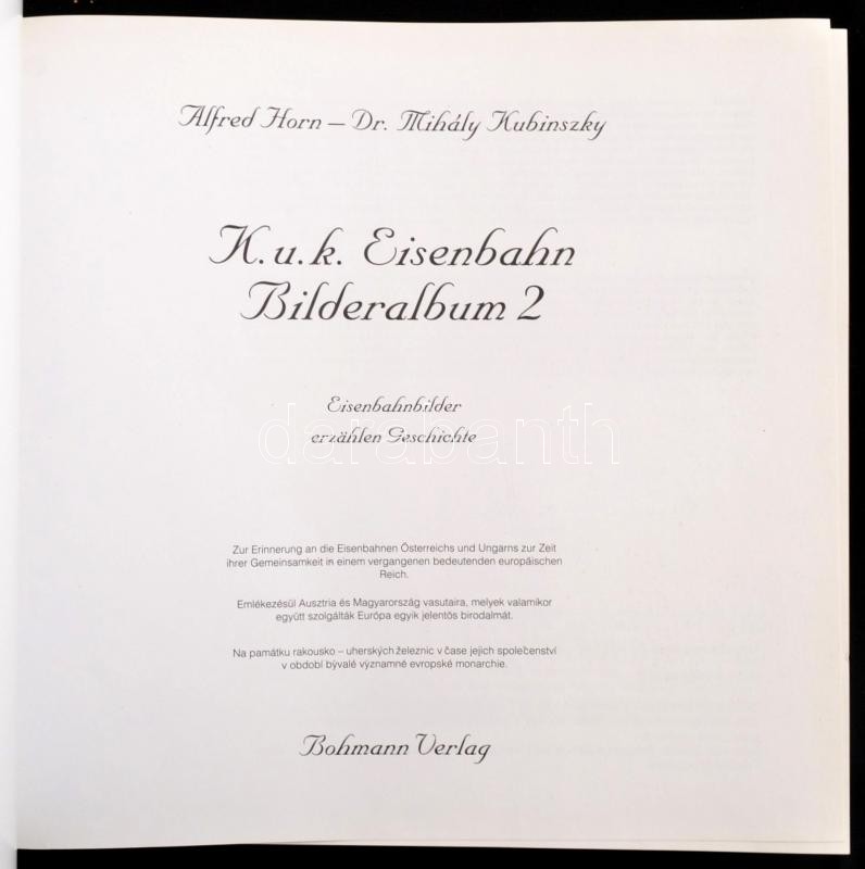 Horn, Alfred-Dr. Kubinszky, Mihály: K.u.K. Eisenbahn Bilderalbum 2. Eisenbahnbilder erzählen Geschichte. Wien, 1993, Bohmann Verlag. Német nyelven. Nagyon gazdag fekete-fehér képanyaggal illusztrált. Kiadói egészvászon-kötés, kiadói papír védőborítóban. Ritka!