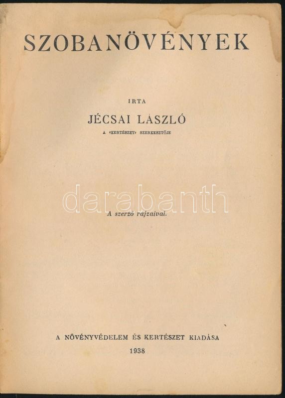 Növényvédelem és kertészet könyvtára 2 kötete (IV.,XV.): Jécsai László: Hogyan készÃtsük el virágos kertünket.; Jécsai László: Szobanövények.; Bp.,1938, Növényvédelem és Kertészet,(Stephaneum-ny.), 61+1+62+2 p. Kiadói papÃrkötés, az egyik kötet lapszélei foltosak, az egyik gerincen apró hiánnyal.