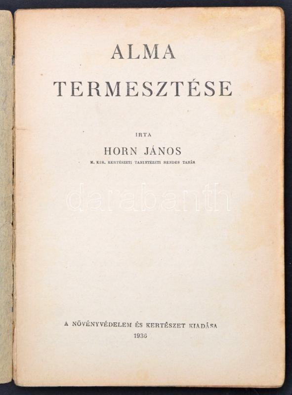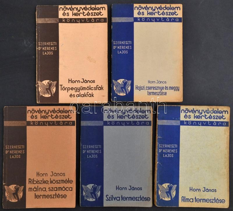 Növényvédelem és kertészet könyvtára 5 kötete (V.,IX.,XVIII.,XXI.,XI.): Horn János: Törpe gyümölcsfák és alakfák.; Horn János: Alma metszése.; Horn János: Ribiszke, köszméte, málna, szamóca termesztése.; Horn János: Kajszi- cseresznye és megy termesztése.; Horn János: Szilva termesztése.; Bp.,1935-1939, Növényvédelem és Kertészet,(Stephaneum-ny.),70+2+72+59+5+60+4+62+2 p. Kiadói papírkötés, változó állapotban, az egyik gerincén hiánnyal, az egyik borítója szakadozott, a hátsó borító részben elvált a kötésétől, az egyik lapszélein folttal.