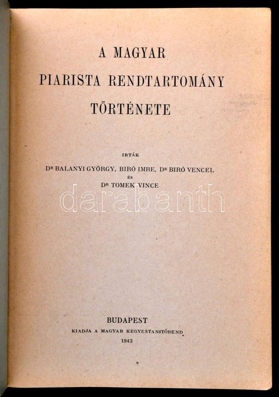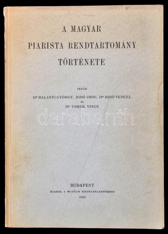 Dr. Balanyi György-Bíró Imre-Dr. Bíró Vencel-Dr. Tomek Vince: A magyar piarista rendtartomány története. Bp.,1943, Magyar Kegyes Tanítórend,(Stephaneum-ny.), 373+2 p.+1 kihajtható térképpel. Kiadói papírkötésben, jó állapotban.