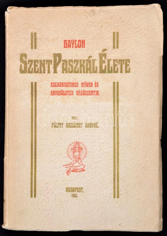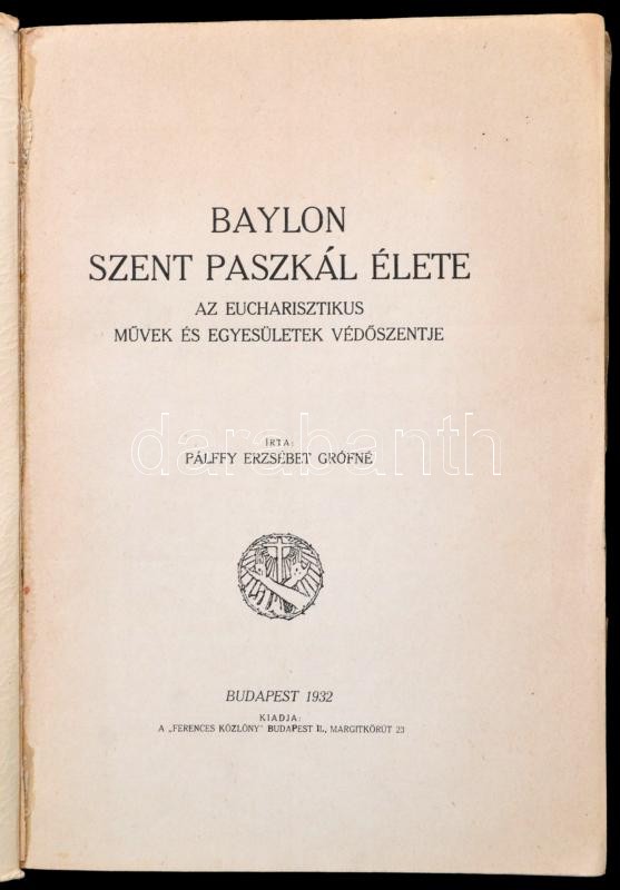 Pálffy Erzsébet: Baylon Szent Paszkál élete. Eucharisztikus művek és egyesületek védőszentje. Bp.,1932, "Ferences Közlöny",(Vác, Kapisztrán Nyomda-ny.), 322 p. Kiadói papírkötés, szakadt borítóval.