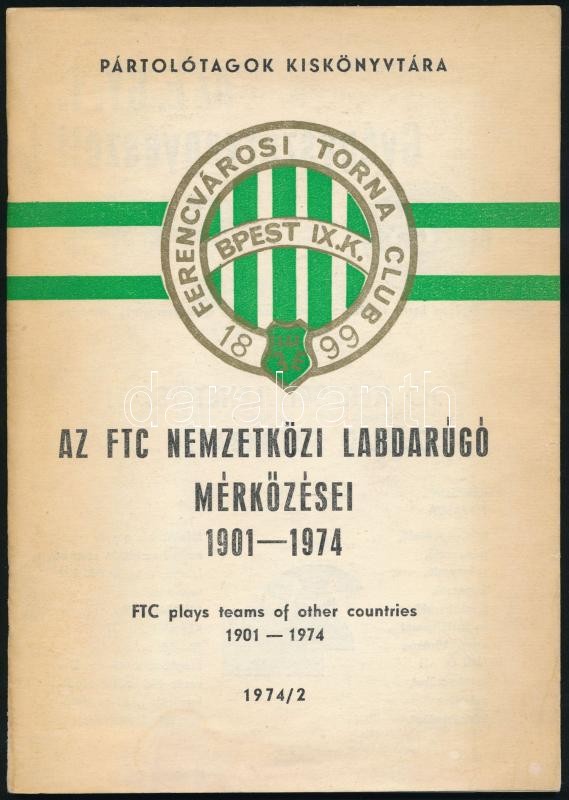 Nagy Béla: Az FTC nemzetközi labdarúgó mérkőzései. 1901-1974. FTC plays team of other countries 1901-1974. Pártolótagok Kiskönyvtára 1974/2. Bp.,1974, FTC,(Zalaegerszeg, Magyar Hirdető-ny.), 46 p. Magyar és angol nyelven. Kiadói papírkötés.
