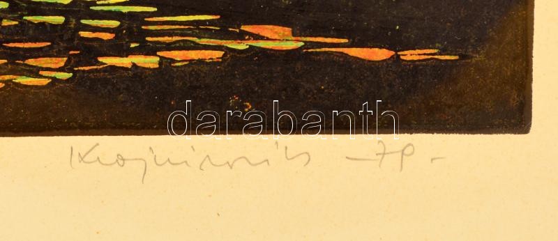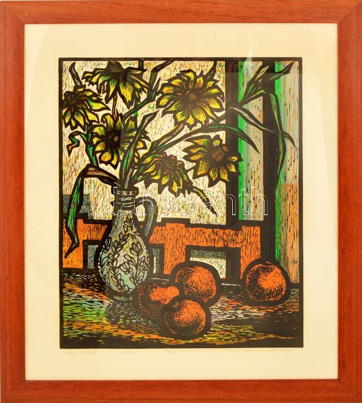 Beschreibung: Krajcsirovits Henrik (1929-2007) : Sárga virágok. Színes linó, papír, jelzett, üvegezett keretben, 48×39 cm