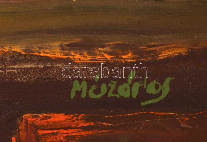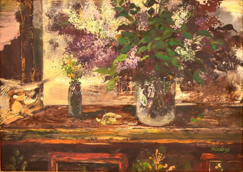 Beschreibung: Mészáros jelzéssel: Asztali csendélet. Olaj, farost, keretben, 50×70 cm