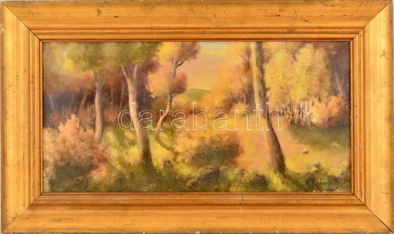 Beschreibung: Spányi jelzéssel: Erdő részlet. Olaj, karton, keretben, 22×44 cm