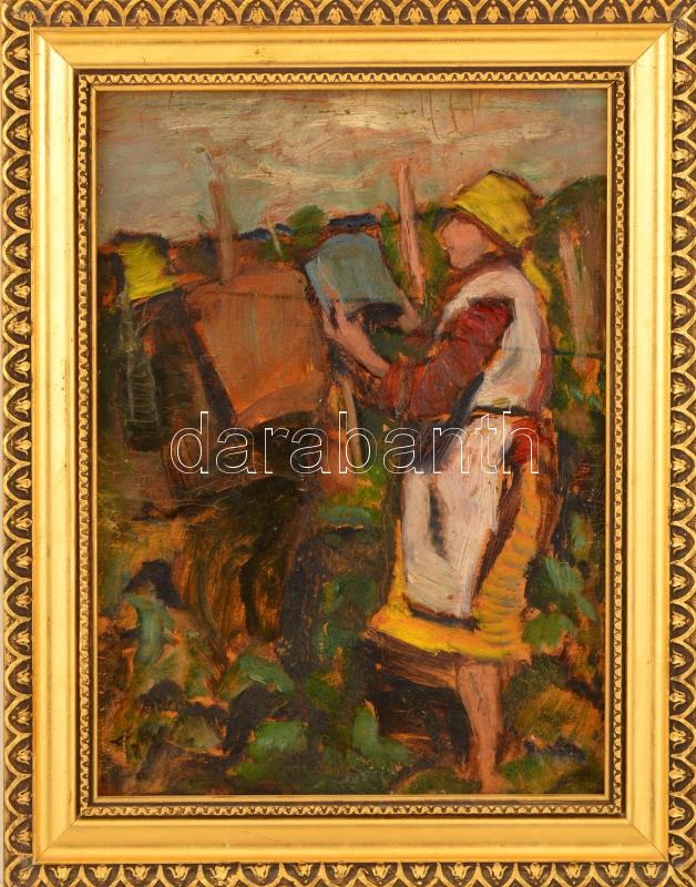 Beschreibung: Tibor Ernő (1885-1945): Szüretelő. Olaj, karton, jelzett, keretben, 35×25 cm
