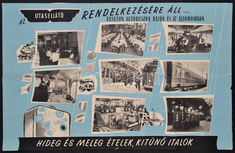 Beschreibung: 1953 Magyarország autóbuszhálózata, MÁVAUT vonalakkal, hátoldalon Országos Takarékpénztár reklámmal, hajtott, szakadással, 41×65 cm