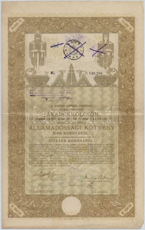 Beschreibung: Budapest 1915. "A Magyar Korona Országai 6%-kal kamatozó Járadékkölcsön" államadóssági kötvénye 10.000K-ról T:II,II-