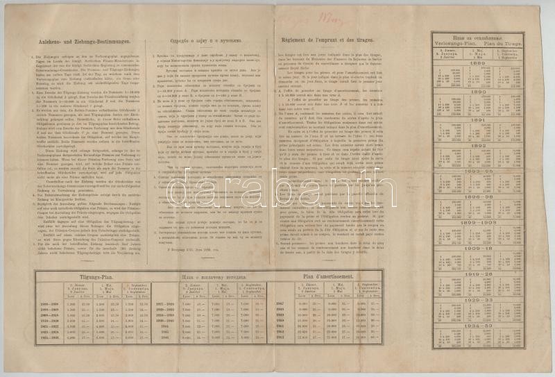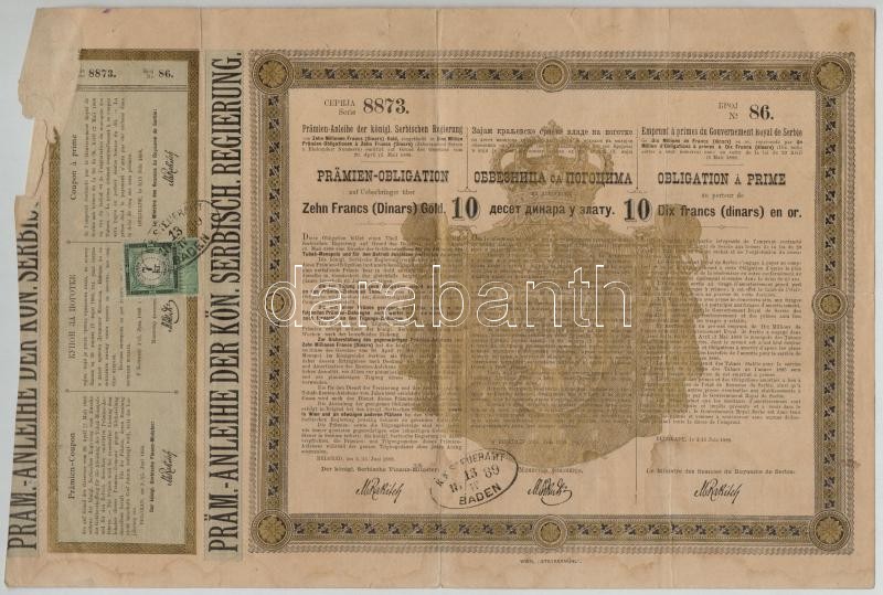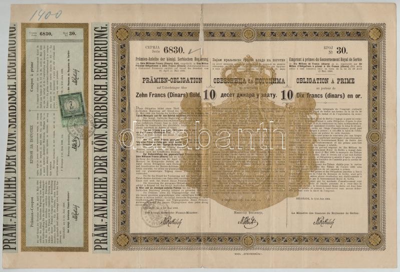Serbia / Belgrade 1888. "Premium Obligation about 10 gold Dinara" with Austrian stamps and cancellation (2x) C:F tears