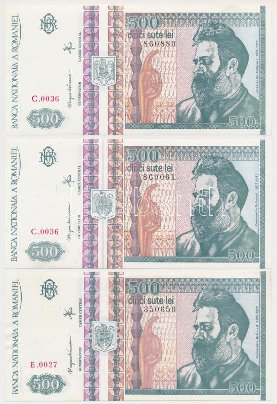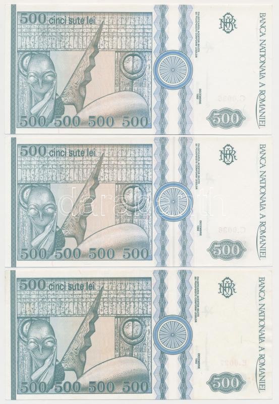 Romania 1992. 500 Lei (3x) sequential serials C:UNC,AU