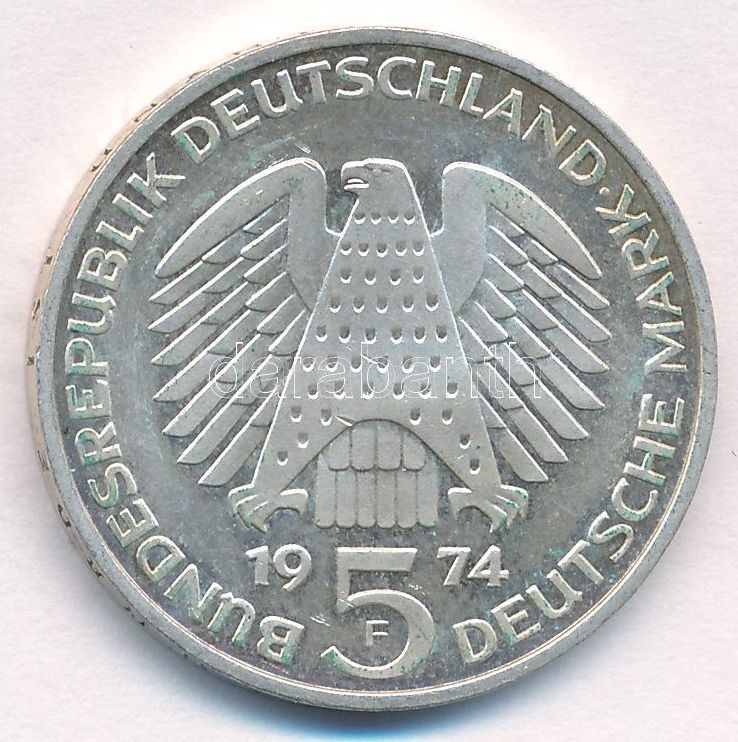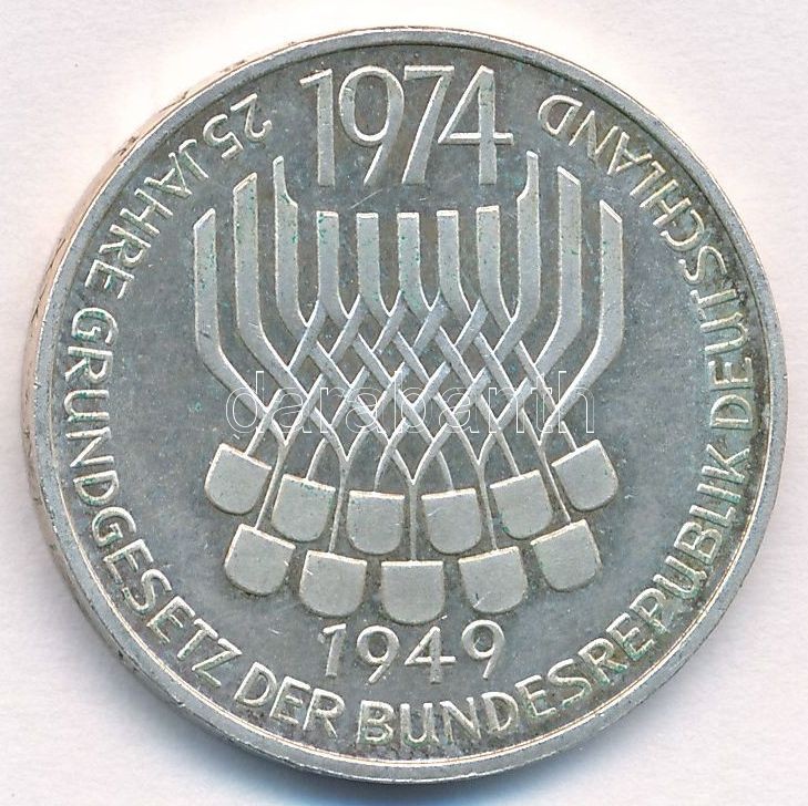 NSZK 1974F 5M Ag "25 éves az Alkotmány" T:1- patina FRG 1974F 5 Mark Ag "25th Anniversary - Constitutional Law" C:AU patina Krause KM#138