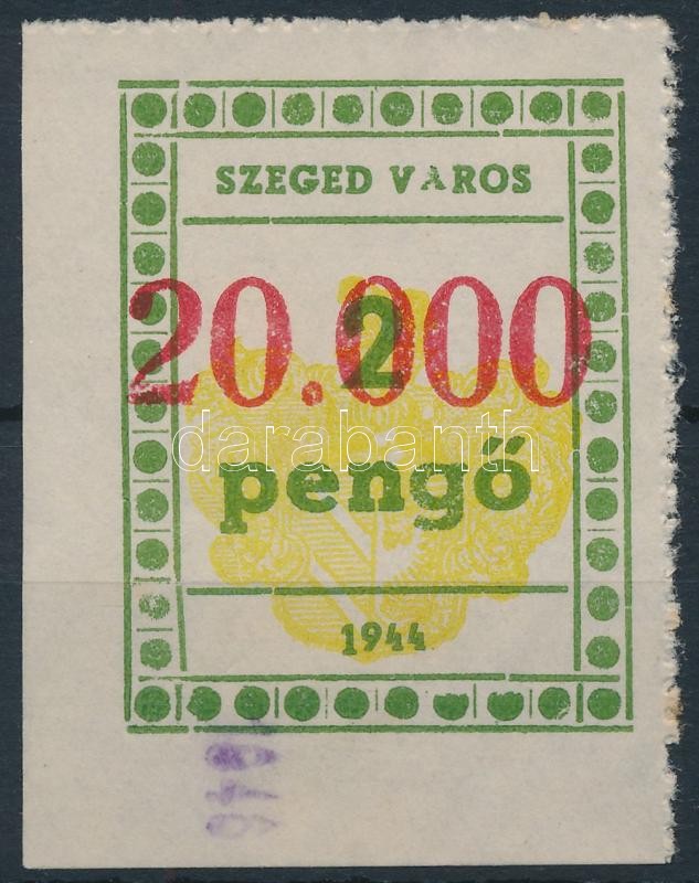 1946 Szeged városi 20.000P/2P ívsarki illetékbélyeg (6.000) https://www.darabanth.com/de/349-Fernauktion/349.0/Philatelie-und-Postgeschichte-Ungarn/Stempelmarken~500016/1946-Szeged-varosi-20000P2P-ivsarki-illetekbelyeg-6000~II1982397