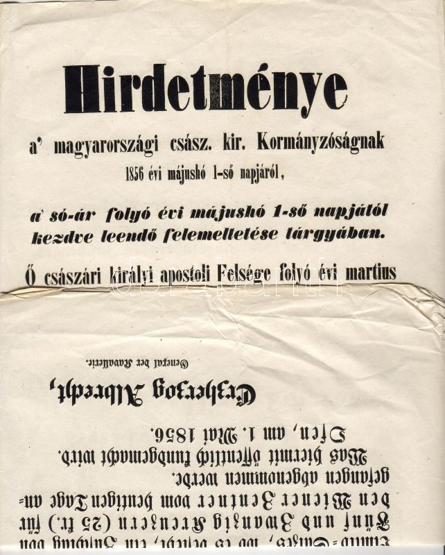1856 Hirdetmény sóáremelésről német és magyar nyelven https://www.darabanth.com/de/35-Fernauktion/35.0/Andere-Sammelgebiete/~187/1856-Hirdetmeny-soaremelesrol-nemet-es-magyar-nyelven~II69895