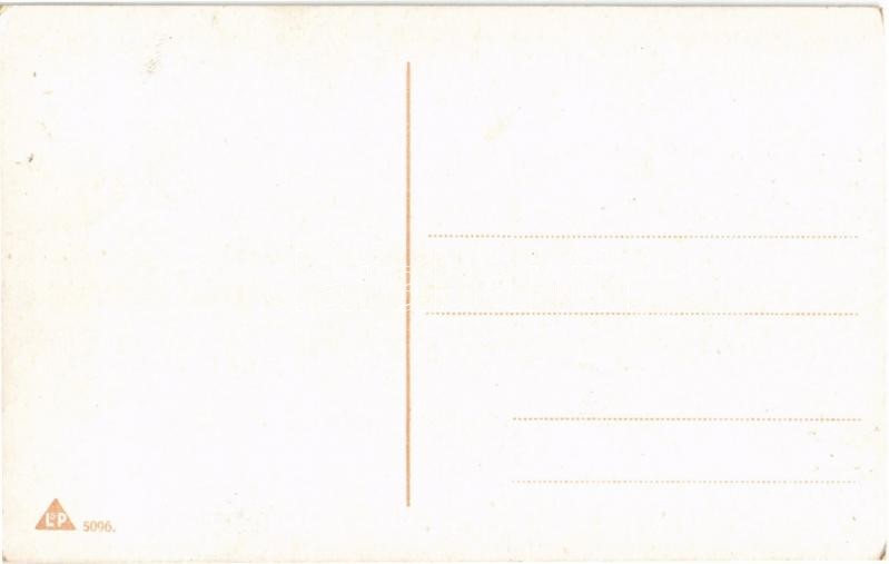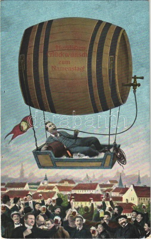 Névnapi üdvözlet! Sörivó férfi hordóléghajón / Herzlichen Glückwunsch zum Namenstag! / Name Day greeting, man drinking beer in barrel airship. L&P 5096.