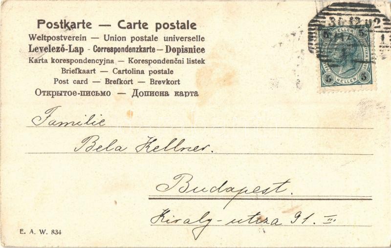 Beschreibung: 1902 Újévi üdvözlet kéményseprő hölggyel / Prosit Neujahr! / New Year greeting with chimney sweeper lady. E.A.W. 834. litho (EK)