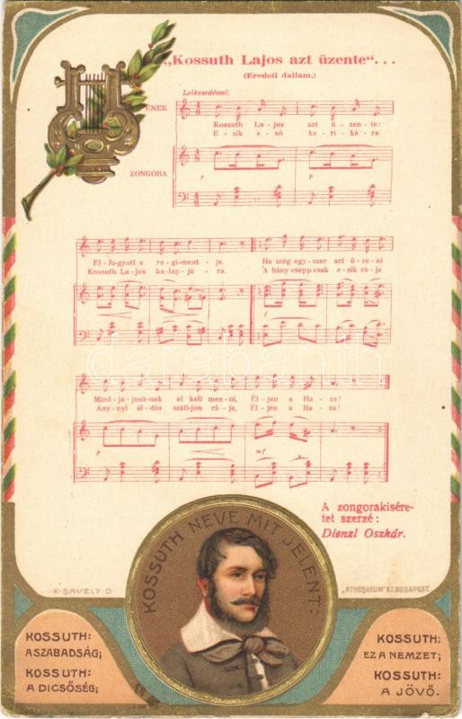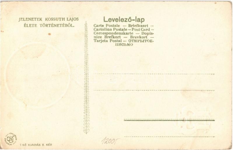 "Kossuth Lajos azt üzente" Jelenetek Kossuth Lajos élete történetéből 1. kiadás II. kép. Szecessziós dombornyomott litho / Scenes from the life of Lajos Kossuth. Athenaeum rt. Art Nouveau, Emb. litho s: K. Sávely D. (EK)