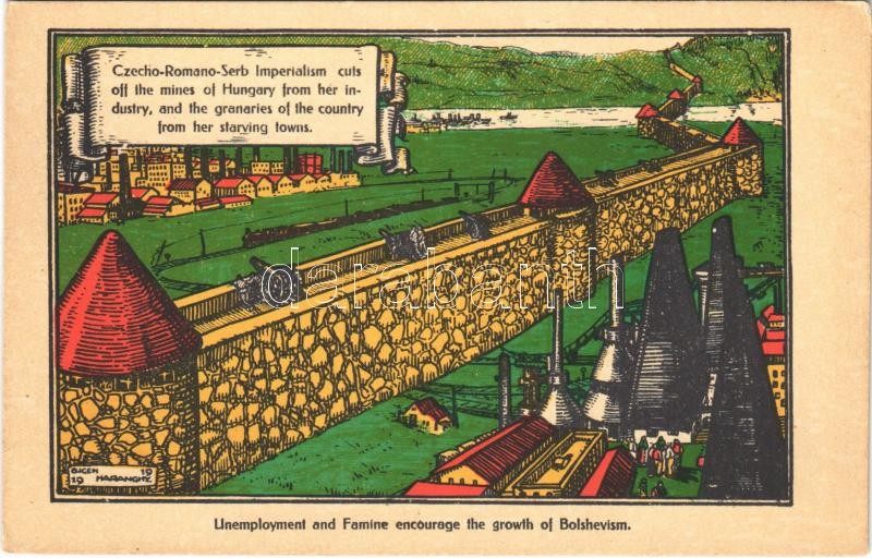 A cseh-román-szerb imperializmus Magyarországon elvágja a bányát a nagyipartól, az éléskamrát az éhező városoktól! A munkanélküliség és az éhség tenyészti a bolsevizmust! / Anti-Czecho-Romano-Serb Bolshevism propaganda card. Unemployment and Famine encourage the growth of Bolshevism. Hungarian irredenta s: Eugen Haranghy