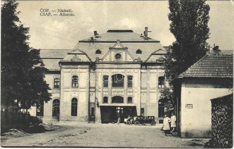 Beschreibung: Csap, Cop, Chop; vasútállomás, autó, üzlet / Nádrazí / railway station, automobile, shop (fl)