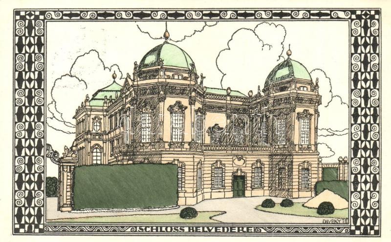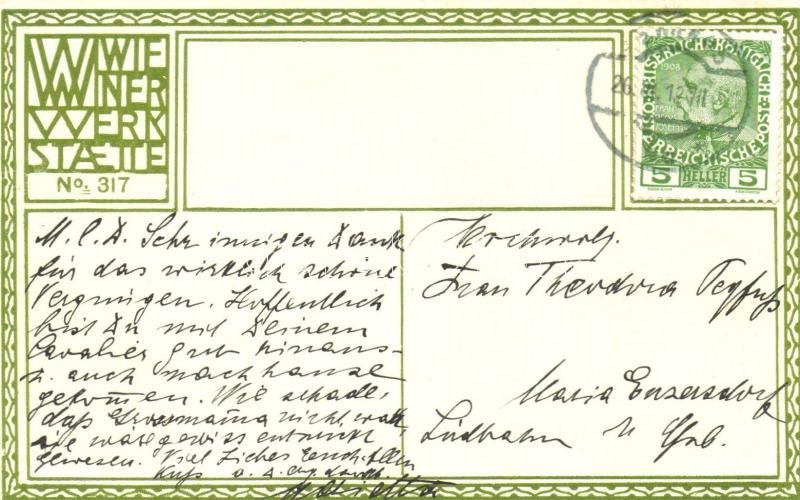 Schloss Belvedere in Wien / Marietta Peyfuss saját kezű levele (Wiener Werkstätte egyik művésznője, szövettervező, Wiener Kunst im Haus csoport egyik alapítója) / Artwork and letter of Marietta Peyfuss (female artist of Wiener Werkstätte, cloth designer, one of the founders of Wiener Kunst im Haus). Wiener Werkstätte No. 317. s: Diveky