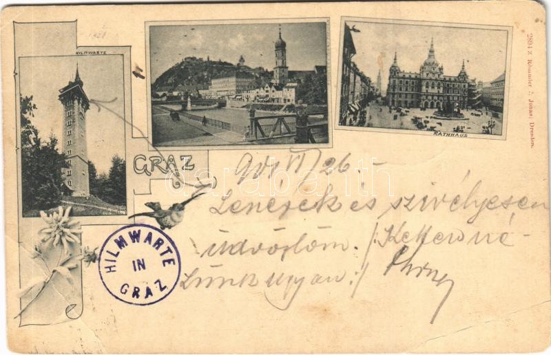 1901 Graz, Hilmwarte, Rathhaus / lookout tower, town hall. Art Nouveau... https://www.darabanth.com/de/35-Gross-Auktion/35.1/Ansichtskarten/Osterreich~14682/1901-Graz-Hilmwarte-Rathhaus-lookout-tower-town-hall-Art-Nouveau-floral-EB~II2361694