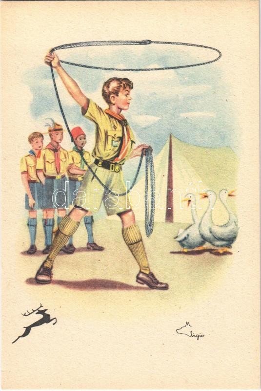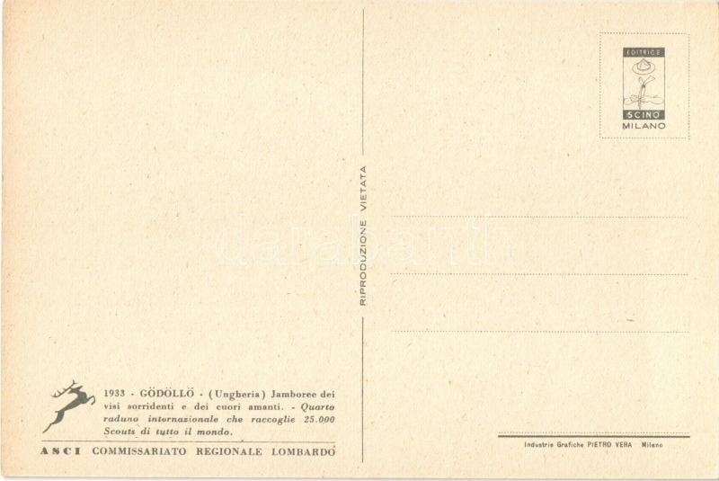 1933 Gödöllő, Cserkész Világ Jamboree: cserkész fiú lasszóval. Olasz kiadás / IV. Scout Jamboree. ASCI Commissariato Regionale Lombardo - Italian edition s: Bigio