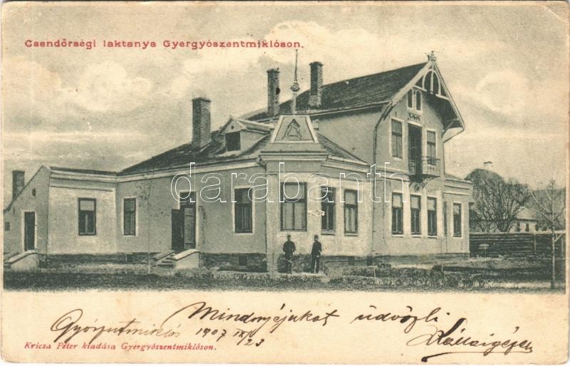 1907 Gyergyószentmiklós, Gheorgheni; Csendőrségi laktanya. Kricsa Péte... https://www.darabanth.com/de/35-Gross-Auktion/35.1/Ansichtskarten/Siebenburgen~14667/1907-Gyergyoszentmiklos-Gheorgheni-Csendorsegi-laktanya-Kricsa-Peter-kiadasa-gendarme-bar~II2363514