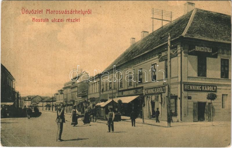 1917 Marosvásárhely, Targu Mures; Kossuth utca, Borhegyi Gyula, Henning Károly, Bartscht Károly, Babos Egyed üzlete, utcai árusok. W.L. (?) No. 33. / street, shops, street vendors + "M. KIR. 61. GYALOGHADOSZTÁLY MENETALAKULATAINAK CSOPORTPARANCSNOKSÁGA" (EK)