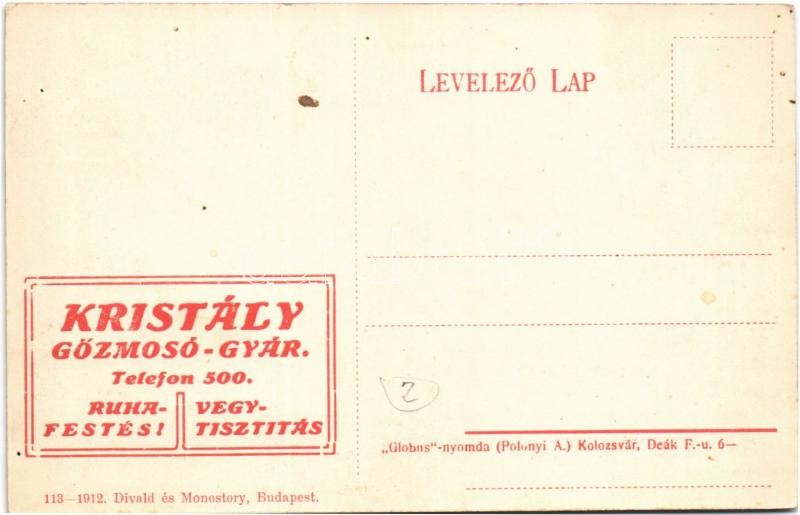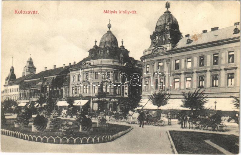 Kolozsvár, Cluj; Mátyás király tér, lovashintók, Haraszthy Jenő üzlete. Kristály Gőzmosó Gyár reklámja a hátoldalon / square, horse chariots, shop. Laundry advertisement on the backside
