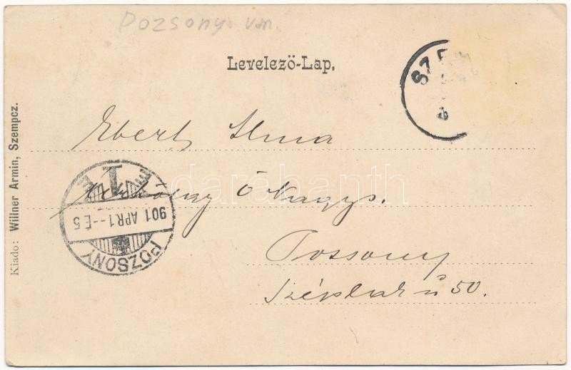 Beschreibung: 1901 Szenc, Szempcz, Senec; Római katolikus templom, Magyar utca, lovaskocsik. Szecessziós litho keret, Willner Armin kiadása / church, street, horse carts. Art Nouveau, litho
