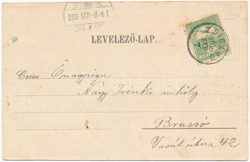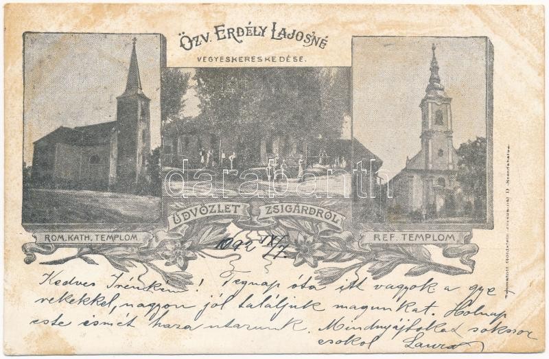 1902 Zsigárd, Zigárd, Zihárec; Római katolikus és református templom, Özv. Erdély Lajosné üzlete. Goldstein Józsua kiadása / churches, shop. Art Nouveau, floral (EK)
