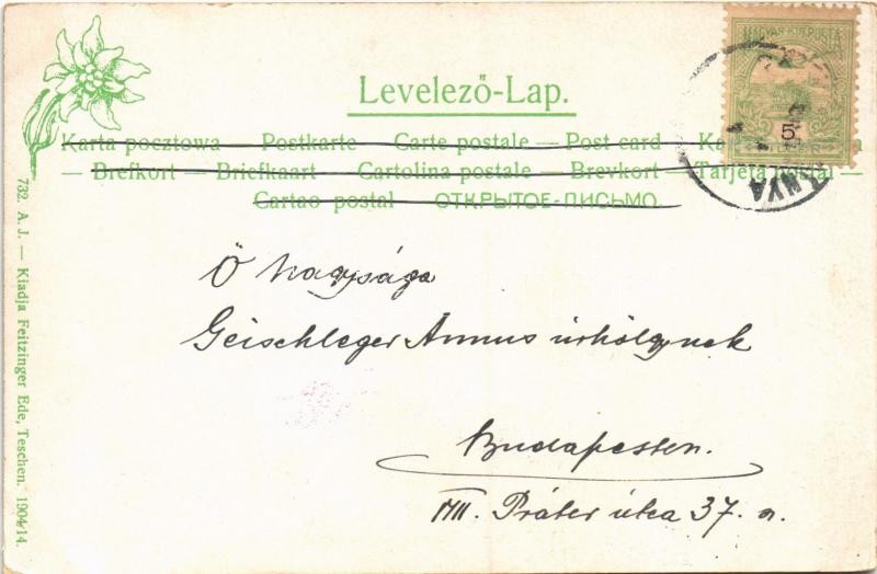 1904 Gölnicbánya, Gelnica; bányaváros, Fő tér, városháza, templom, Toffler J. üzlete. Feitzinger Ede 1904/14. 732. A.J. / main square, town hall, church, shop (EK)