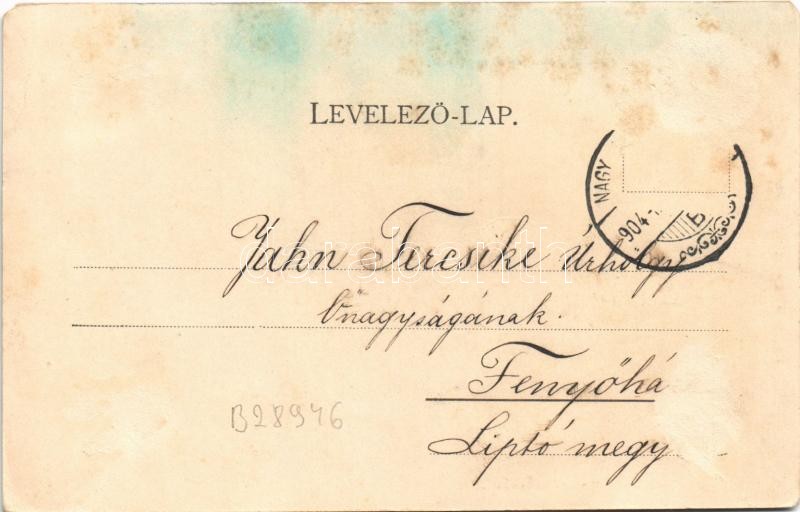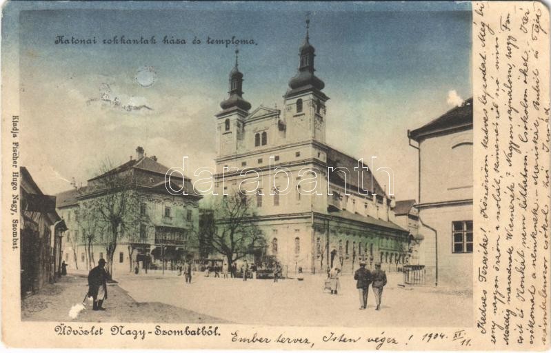 1904 Nagyszombat, Tyrnau, Trnava; tér, katonai rokkantak háza és templom, üzletek. Fischer Hugo kiadása / square, shops, house and church of the military disabled (Rb)