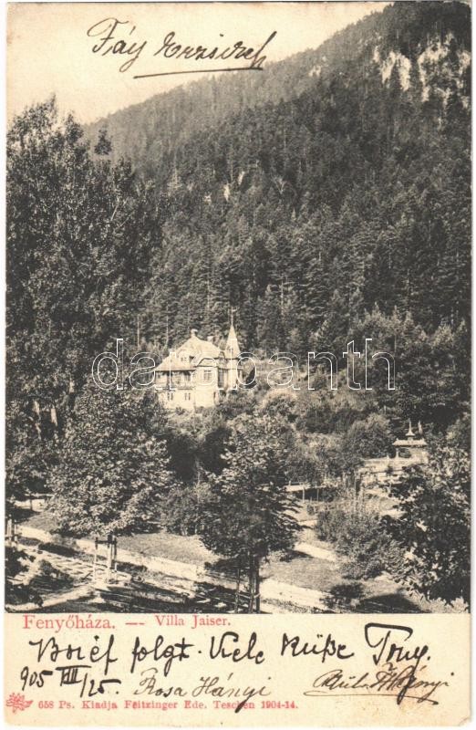 1905 Fenyőháza, Lubochna; Villa Jaiser. Feitzinger Ede 1904-14. 658. P... https://www.darabanth.com/de/35-Gross-Auktion/35.1/Ansichtskarten/Slowakei~14668/1905-Fenyohaza-Lubochna-Villa-Jaiser-Feitzinger-Ede-1904-14-658-Ps-Rb~II2366472