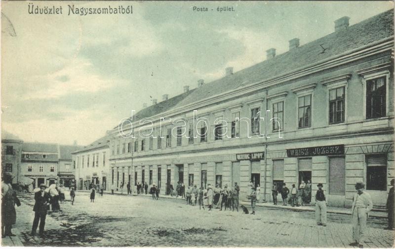 1906 Nagyszombat, Tyrnau, Trnava; Posta épület, utca, Weisz József, Herczog Lipót üzlete, gyógyszertár. Horovitz Adolf kiadása / post office, shops, street, pharmacy