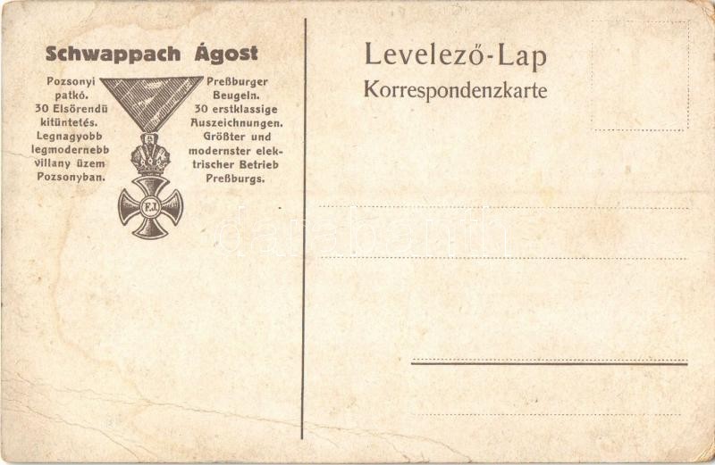 Pozsony, Pressburg, Bratislava; Schwappach Ágost Pozsonyi Patkó reklám... https://www.darabanth.com/de/35-Gross-Auktion/35.1/Ansichtskarten/Slowakei~14668/Pozsony-Pressburg-Bratislava-Schwappach-Agost-Pozsonyi-Patko-reklamlap-pozsonyi-kiflis-udvo~II2364467